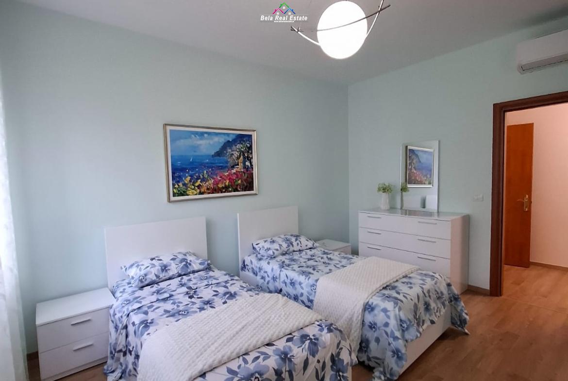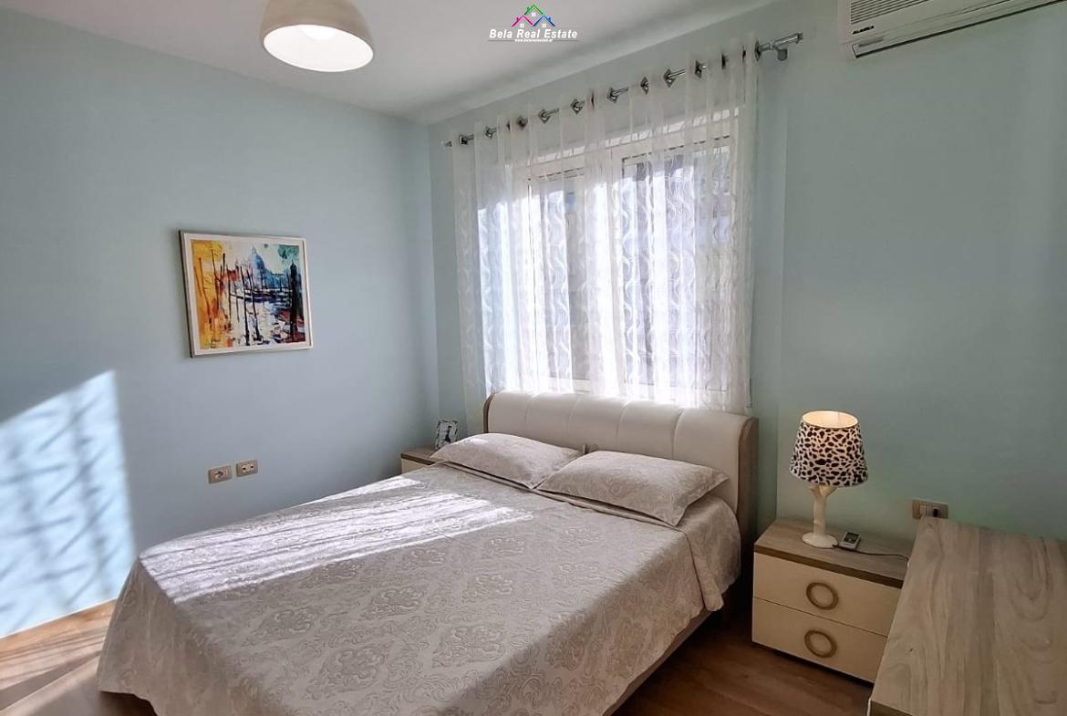 At the Lake, near the Zoo, Eduart Mano Street, two bedrooms apartment for rent, surface 115 m2, 3rd floor, new building with elevator, 2 bathrooms, 2 balconies, corridor, parquet, air conditioning, furnished in a contemporary way, parking space included in the price. A.K.